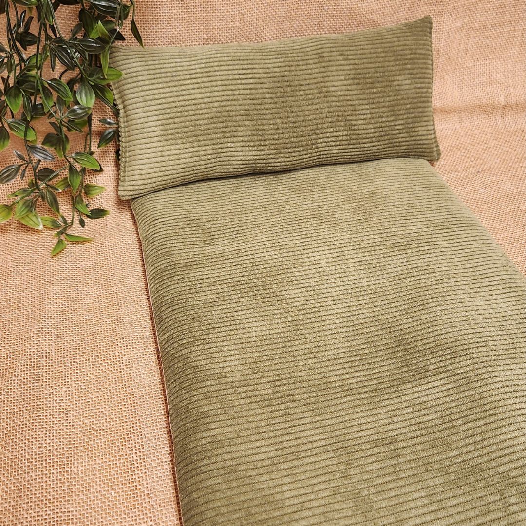 Ensemble parure lit IKEA DUKTIG – Coussin + tapis imperméable velours côtelé olive🛏️🐱