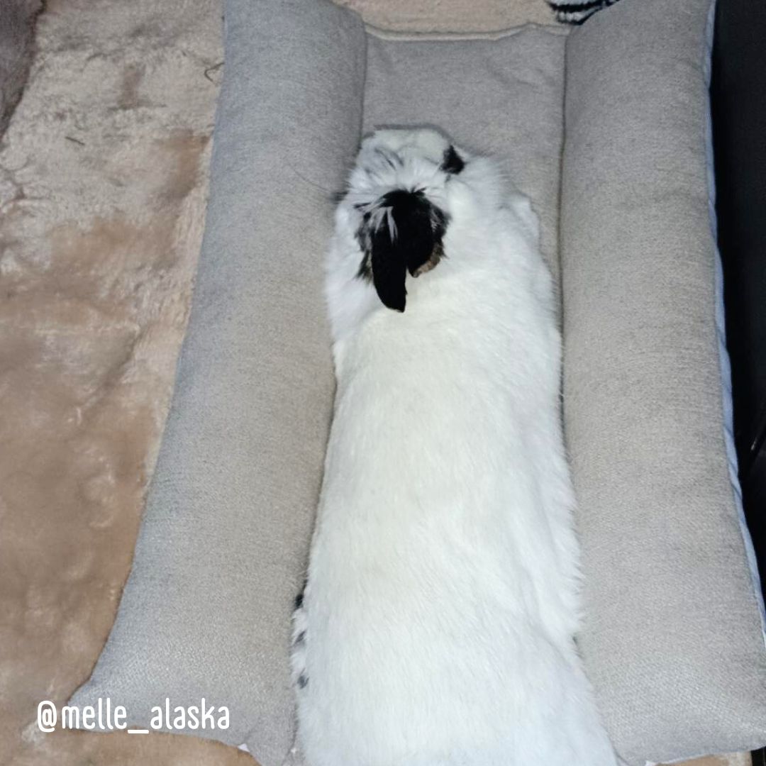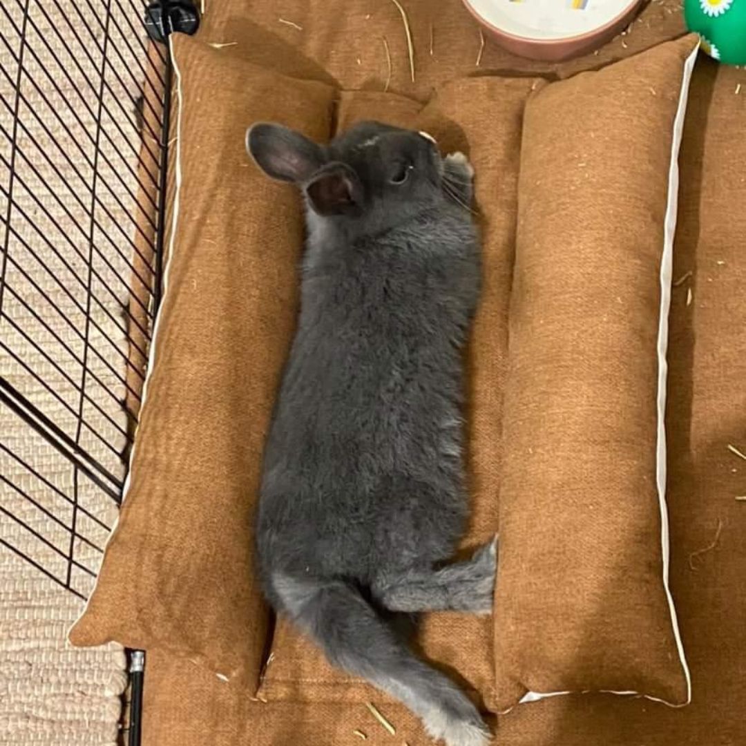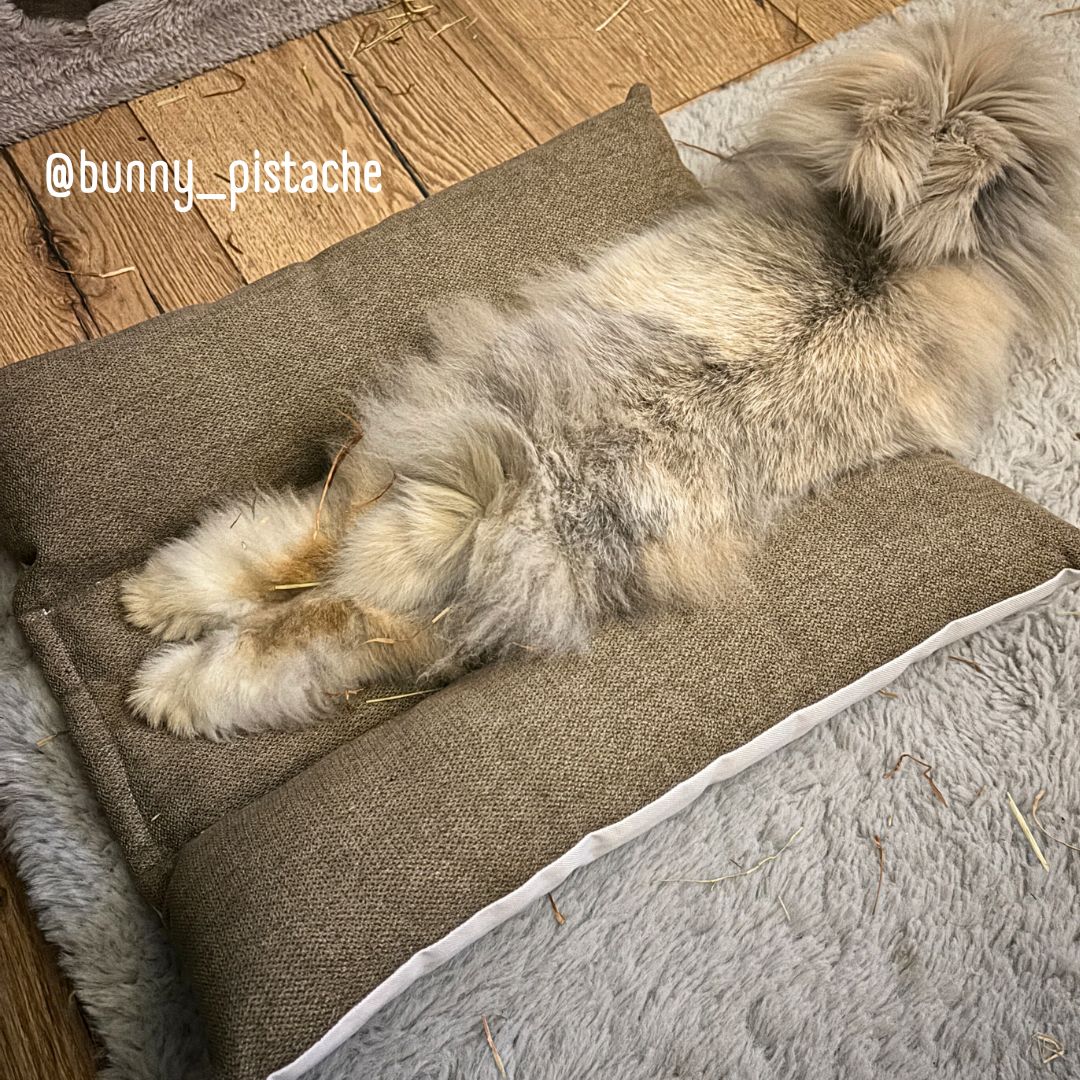 Confortablement allongé, les pattes en arrière, détendu comme jamais… voilà la position typique du lapin heureux et serein 😌. C’est pour lui offrir ce niveau de bien-être que je confectionne les coussins grenouille, un couchage douillet et sécurisant !