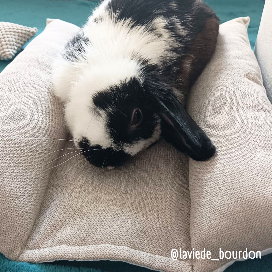 J'ai commandé ce coussin car je souhaitais un beau produit au couleur plus neutre que celui que j'avais pour adoucir l'environnement de mon lapin et le produit est vraiment super ! J'ai été surprise par la fermeté du rembourrage des bords mais c'est parfait pour maintenir Bourdon qui, avec ses problèmes d'équilibre a tendance à pencher sur un côté.