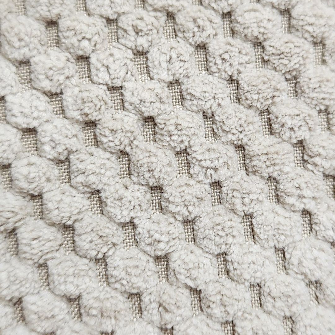 - 1 tissu en velours nid d'abeille : 90% polyester et 10% nylon un touché doux et un tombé ferme. Le tissu est épais et résistant aux multiples lavages.